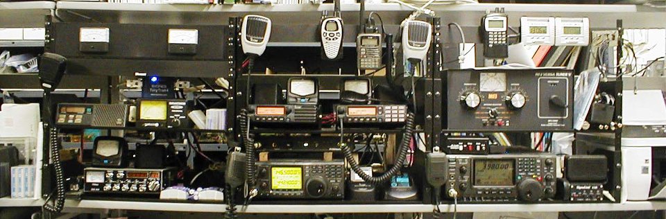 Left rack; Top: 12V Battery Backup Switch. Middle shelf: KJ4AJP-1 APRS station on GE MVS VHF (programmed into 2M Amateur) w/TinyTrak4 TNC, spare AA nicads. Bottom shelf: Galaxy DX959 11M (CB), two 4-nicad chargers. Center rack; Top panel: Midland GXT710 GMRS/FRS w/NOAA weather alert, Uniden BC92XLT scanner. Middle shelf: ICom IC-F2721 UHF LMR, IC-1721 VHF LMR. Bottom shelf: Icom IC-910 2M/70cm with RigBlaster Pro (now Signalink USB). Right rack; Top panel: Clocks for Zulu and 24hr local time. Middle shelf: MFJ 989D tuner, Garmin GPS-12. Bottom shelf: Icom IC-746PRO HF with Signalink USB.