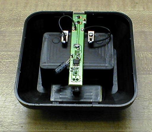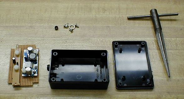 Once I knew what I'd be working with I decided a Hammond 1591XXMSBK would fit the bill, and ordered one from Mouser Electronics. The enclosure has stand-offs for #4 x 1/4" self-tapping screws molded into both the lid and the bottom, so a piece of perf-board could be cut to size and mounted inside. By mounting the CH-5's PCB and LM2596 to that, the only holes necessary in the enclosure are for the power in and out plus the 3mm status LED.