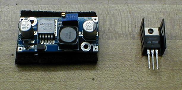 To get the actual 13.8VDC automotive power down to 10V was going to take a step-down regulator of some sort. I had both a LM2596 buck converter module and a LM7810 3-terminal voltage regulator on hand. Albeit larger in size I chose the former because of its cooler operation so I could enjoy the economy of buying a plastic enclosure. The LM7810 could potentially dissapate close to 1/3 of its input voltage as heat, but if I had already had an aluminum case I might have considered using it and heat sink instead. The LM2596 has two mounting holes for #4-40 hardware.